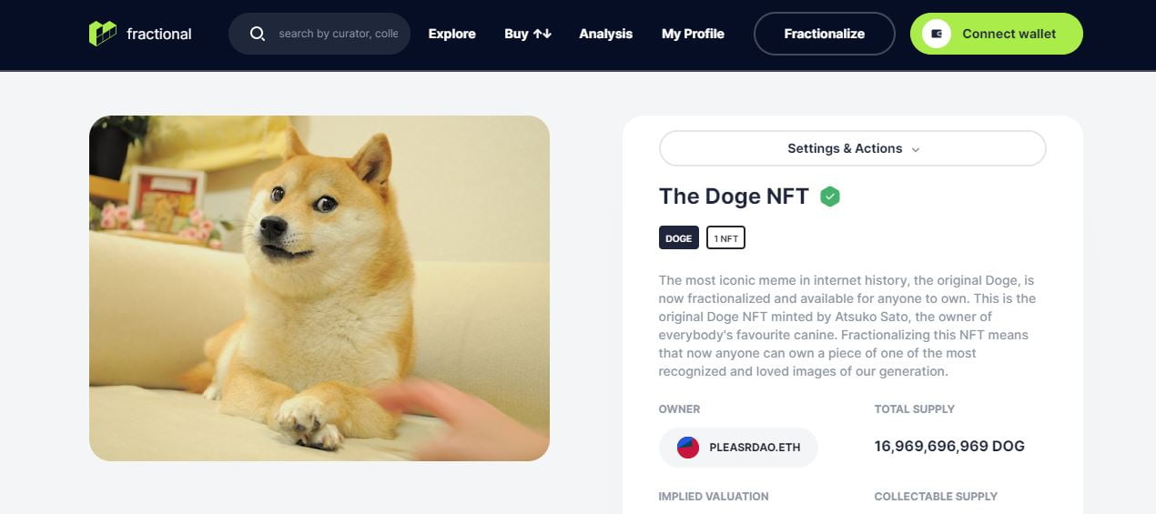 El meme más icónico de la historia de Internet, el Doge original, está ahora fraccionado y disponible para cualquiera. Esta es la NFT original de Doge acuñada por Atsuko Sato, la dueña del canino favorito de todos. Fraccionar este NFT significa que ahora cualquiera puede poseer un trozo de una de las imágenes más reconocidas y queridas de nuestra generación.
