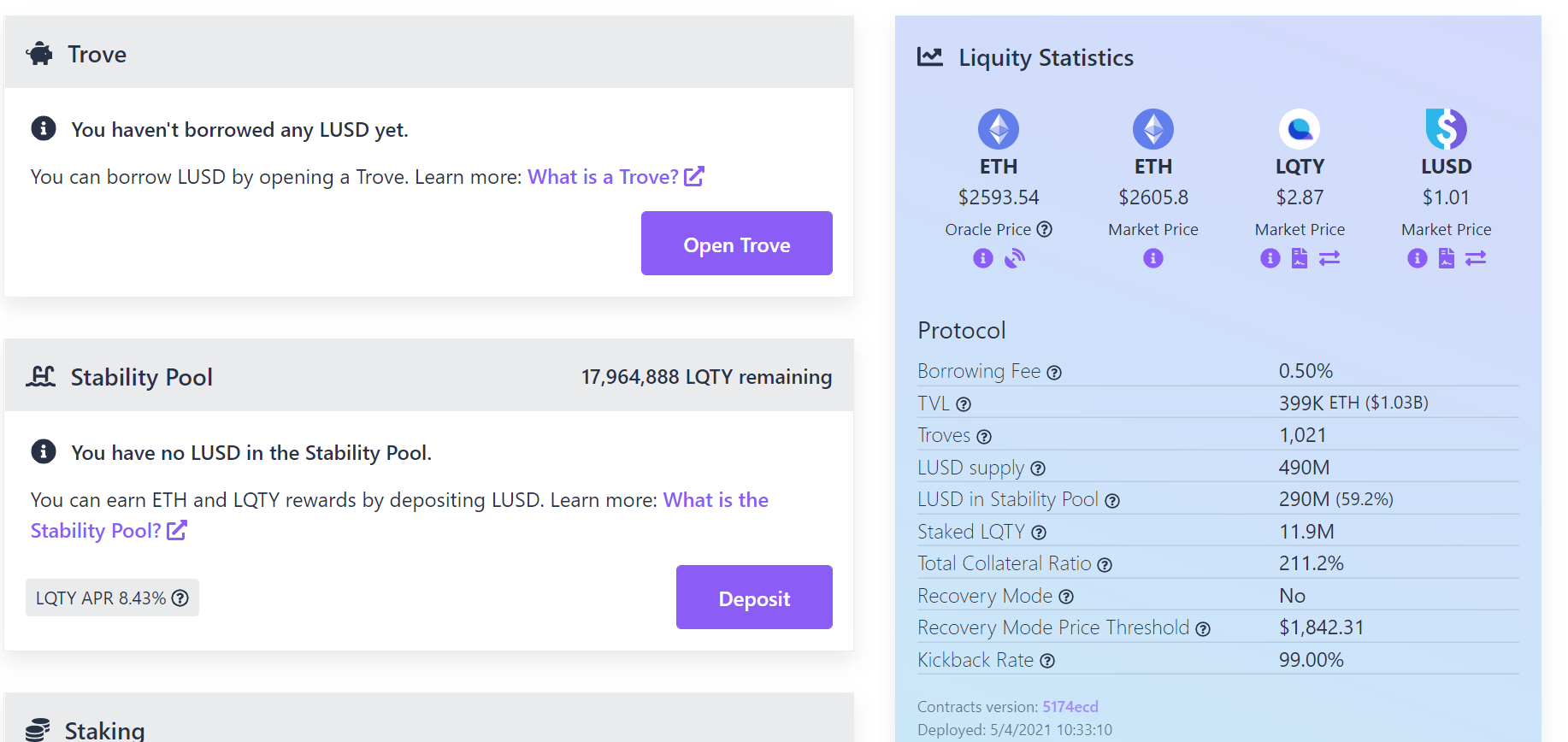 Trove is where you can place your Ethereum to get LUSD as a loan, paying 0% interest. At the moment, you can only place Ethereum, and you will have to borrow a minimum of 2,000 LUSD to use it. So you won’t be able to borrow smaller amounts. Although with the high fees that the Ethereum network has, it wouldn’t make much sense to do so either.