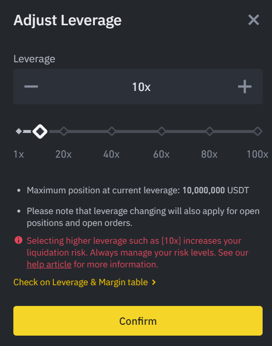 Lo siguiente que debemos selccionar es cruzado o aislado. Puedes ver qué es cada uno, pero mi recomendación es usar cruzado para menos complicaciones. Seguimos con el nivel de apalancamiento, habitualmente viene de serie un 20. En este caso, ya depende de cada uno el riesgo que quiera asumir y el posible beneficio. Mayor apalancamiento, vas a poder sacar más beneficio pero también tiene más riesgo de liquidar tus posiciones. Para este ejemplo vamos a seleccionar 10 de apalancamiento.