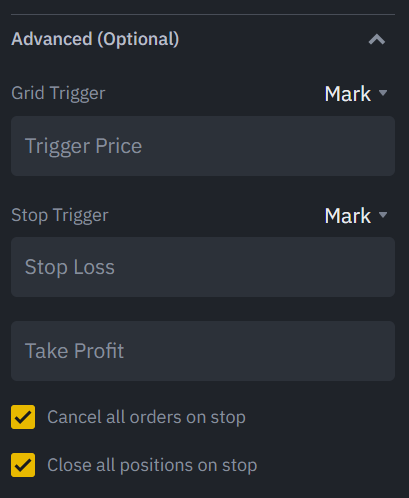 También vamos a encontrar un stop loss, que nos permite parar la cuadrícula cuando el precio de la criptomoneda llegué al valor que hemos indicado. Sin duda, aunque es opcional, es muy interesante y útil indicar también un stop loss para que la cuadricula no opere en un rango de precios que no nos interesa. Por ello, te recomiendo que indiques un precio de stop loss, donde crees que si llega a ese precio, la tendencia de la criptomoneda va a cambiar. Puedes indicar un precio tanto si llega a un precio muy bajo, como si llega a un precio muy alto, y se empieza a mover en otro rango de precios la criptomoneda.