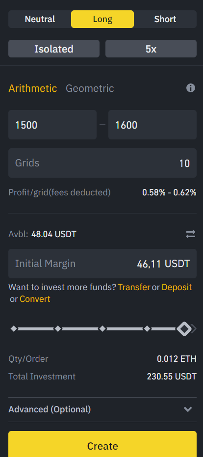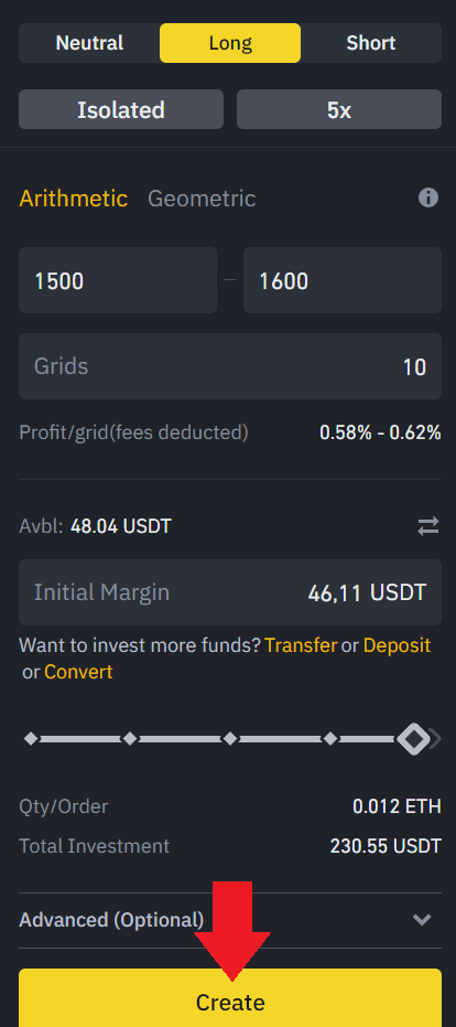 Seguimos con aritmético y geométrico. En el caso de arimtetico la cuadricula tendrá la misma diferencia de precio y en el caso de geométrico, la diferencia será en relación al precio que tenga la criptmoneda. Realmente las dos opciones funcionan bien, dependiendo del precio de la criptomoenda quizá te interesa más usar aritmético o geométrico.