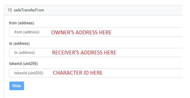 Este es el enlace al contrato de personajes que tienes que acceder : Contrato de comercio de personajes de CryptoBlades, o puedes copiar el siguiente enlace: https://bscscan.com/address/0xc6f252c2cdd4087e30608a35c022ce490b58179b#writeProxyContract.