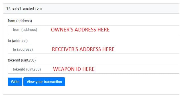 Las armas tienen el mismo funcionamiento para enviarlos de tu cuenta a otra, pero tienen otro contrato, que es el siguiente y el que debes usar, puedes encontrarlo aquí. O copiando el enlace: https://bscscan.com/address/0x7e091b0a220356b157131c831258a9c98ac8031a#writeProxyContract.